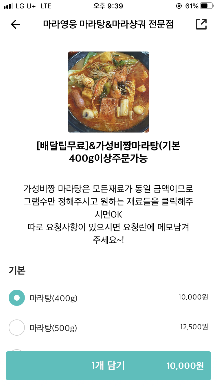 [서울 영등포] 배달전문 음식점, 마라영웅 400g부터 주문 가능한데, 맨날 주문해도 얼마 안돼서 보험으로 500g 주문하였다.