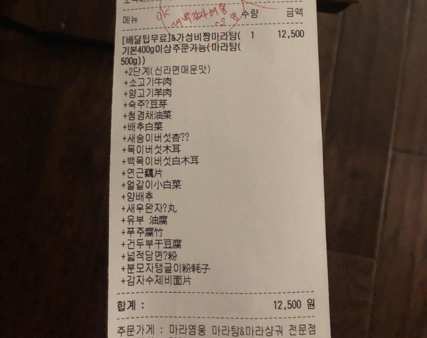[서울 영등포] 배달전문 음식점, 마라영웅 영수증인데, 주문하면서 500g 맞춰서 내가 요청하는 모든 재료를 다 넣어준다.