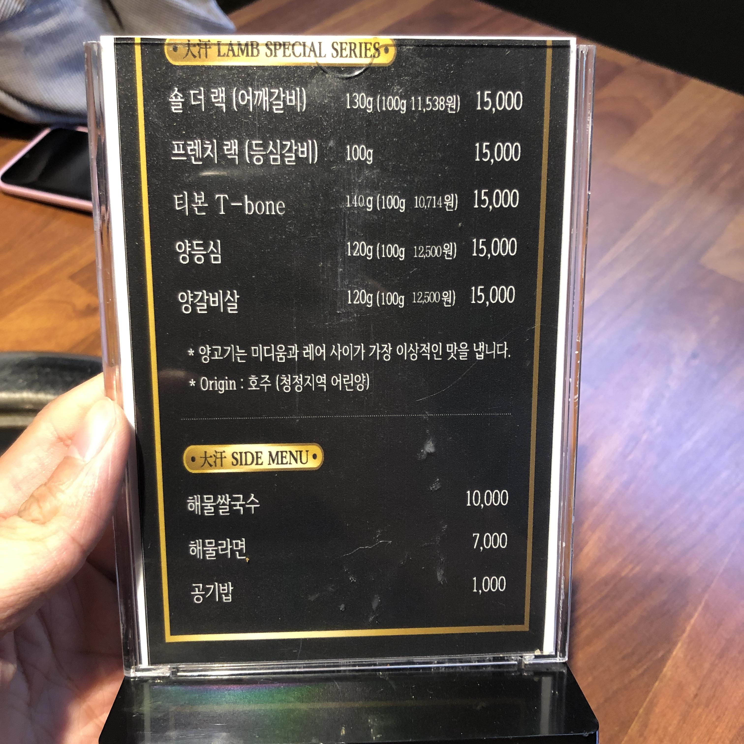 [울산 무거동] 싱싱한양고기, 대칸 양고기_메뉴판1 매장에서는 숄더랙과 프렌치 랙을 추천하여서 먹었다. 사이드메뉴로는 특이하게도 해물쌀국수가 있었다.