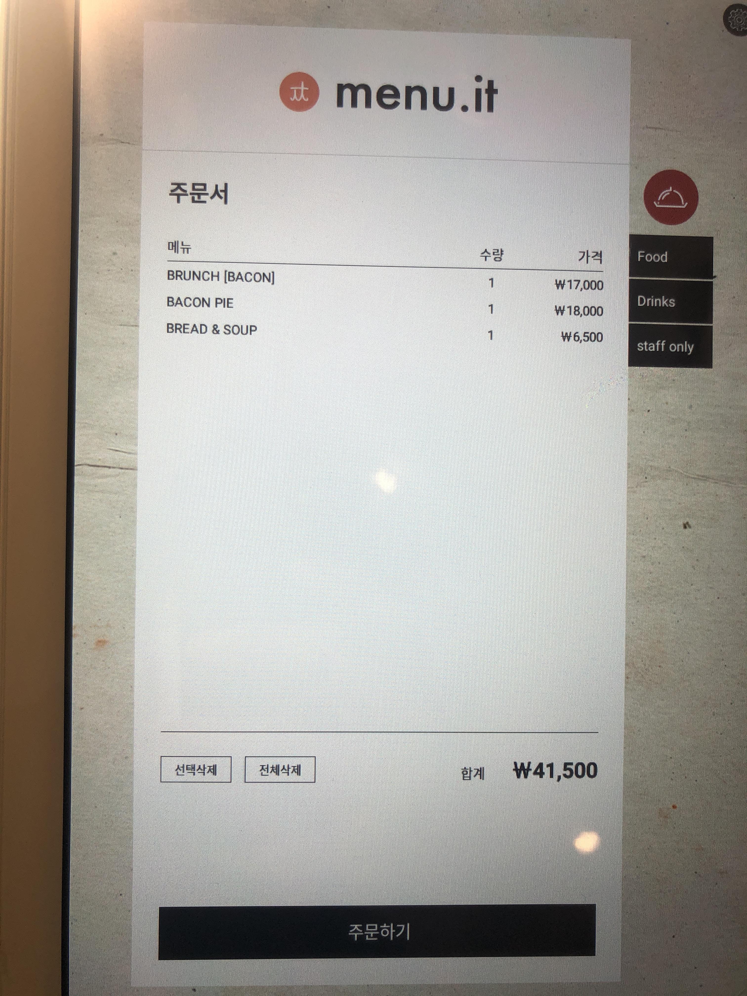 ■ 주문 메뉴 : 브런치(베이컨) 17,000 + 베이컨파이 18,000 + 감자스프 6,500 + 스프라이트 3,000