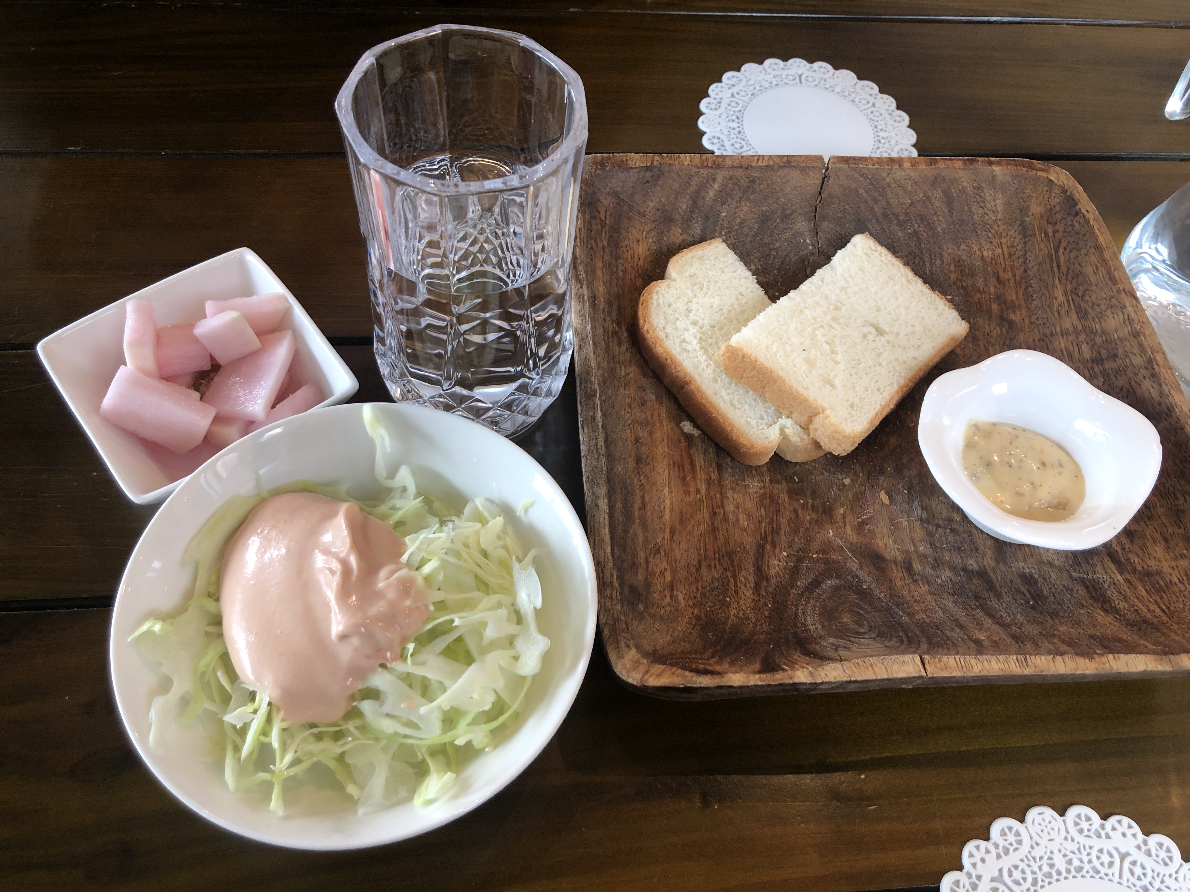 [영천] 매콤하고 소스 두툼한 돈까스, 와이식당 식전에 제공된 식전 빵과 샐러드..! 근데 식전빵 자체는 특별할 게 없었는데, 소스가 너무 맛있었다.