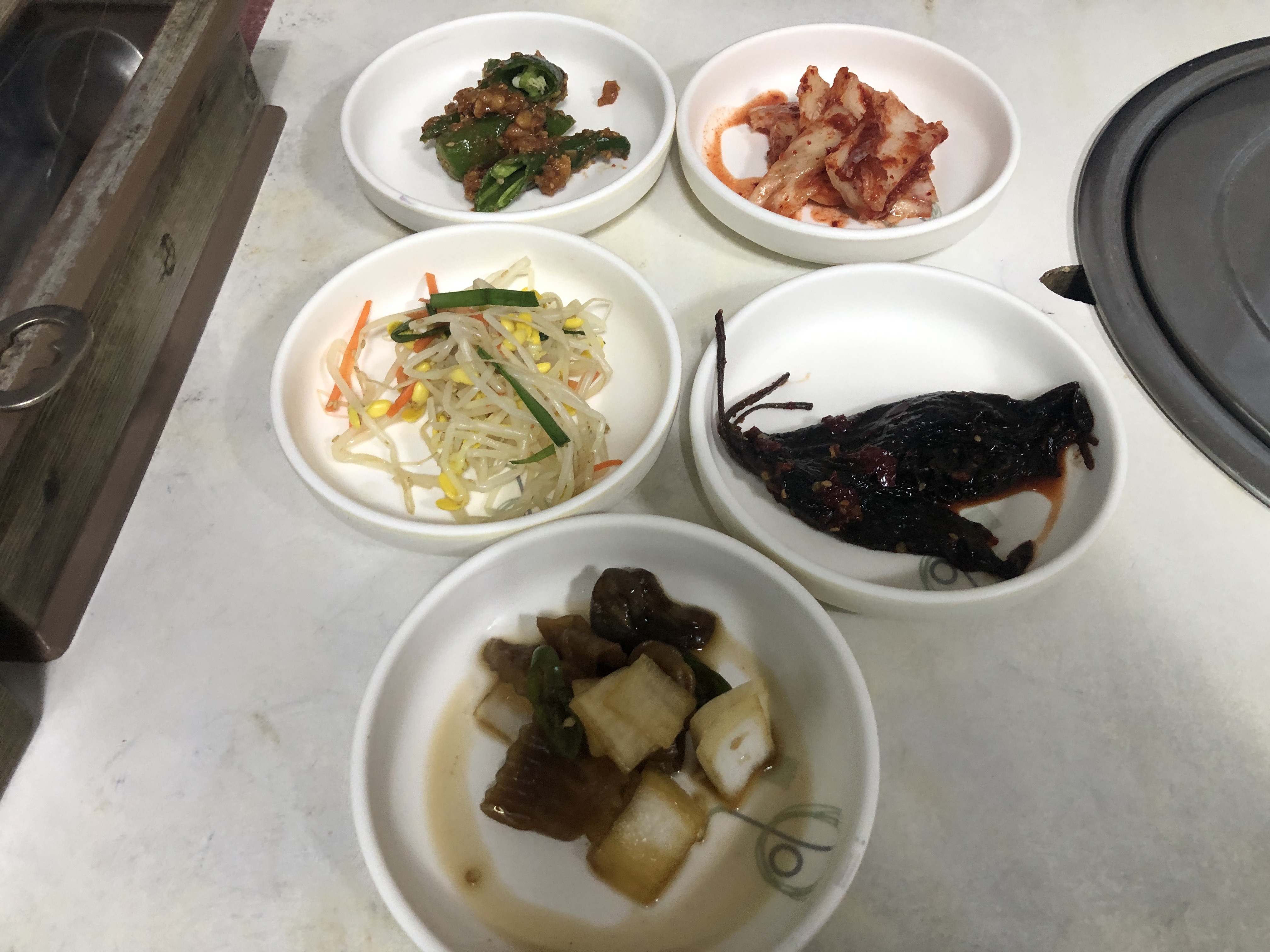 [경북 안동] 닭도리탕과 돌솥밥이 참 맛있는, 동악골금재가든 5가지 종류의 밑반찬! 저번에 왔을땐 된장 고추찌가 잘려지지 않은 채로 나왔는데, 이번엔 잘라져서 나왔다.