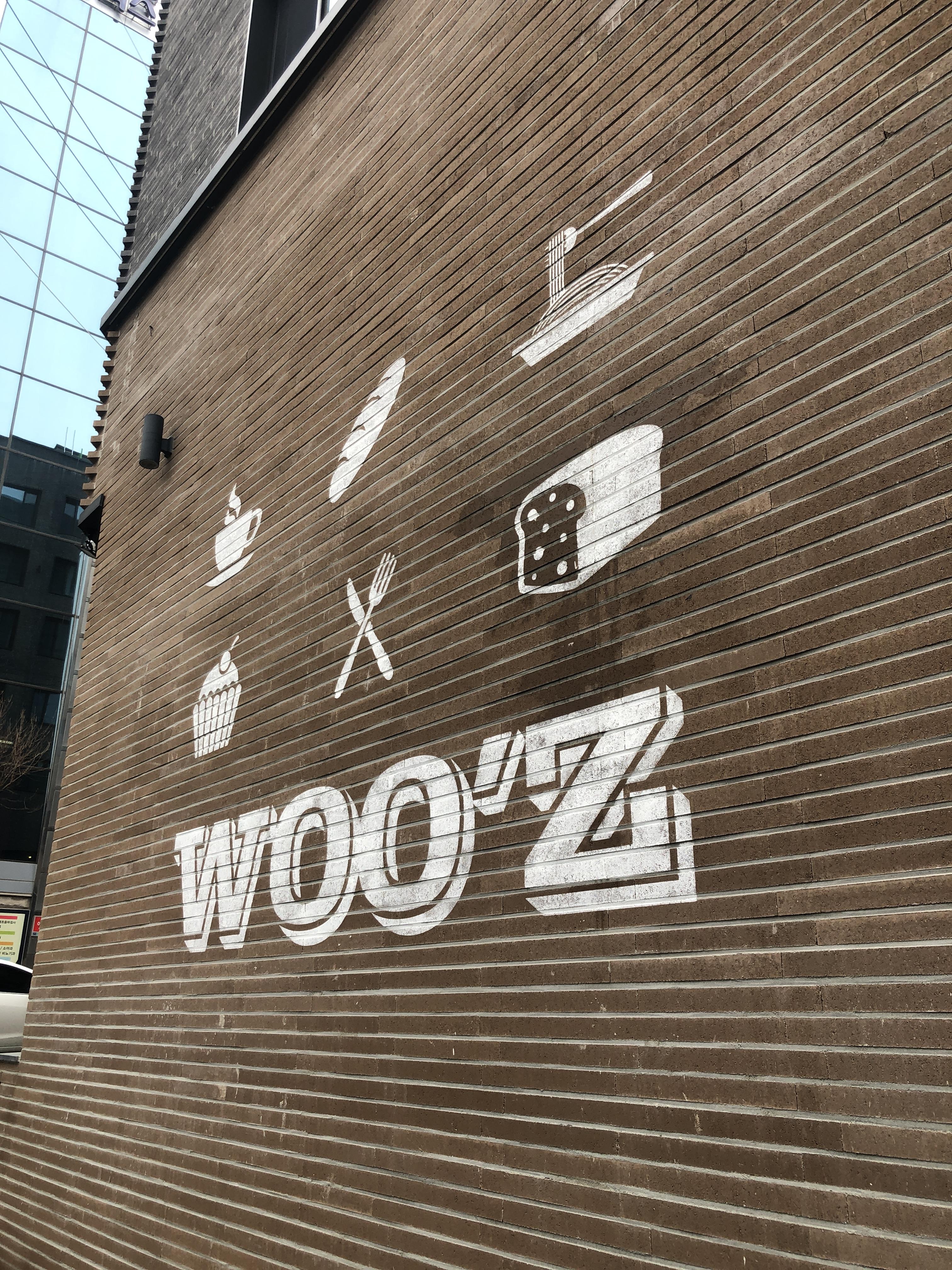 [경북 안동] 요구르트 맛이 나는, 허니크림치즈볼 우즈베이커리 가게가 모퉁이에 있어서 한쪽 벽면에는 가게 이름을 크게 적어두고, 한쪽 벽면에는 매장 입구가 있다.