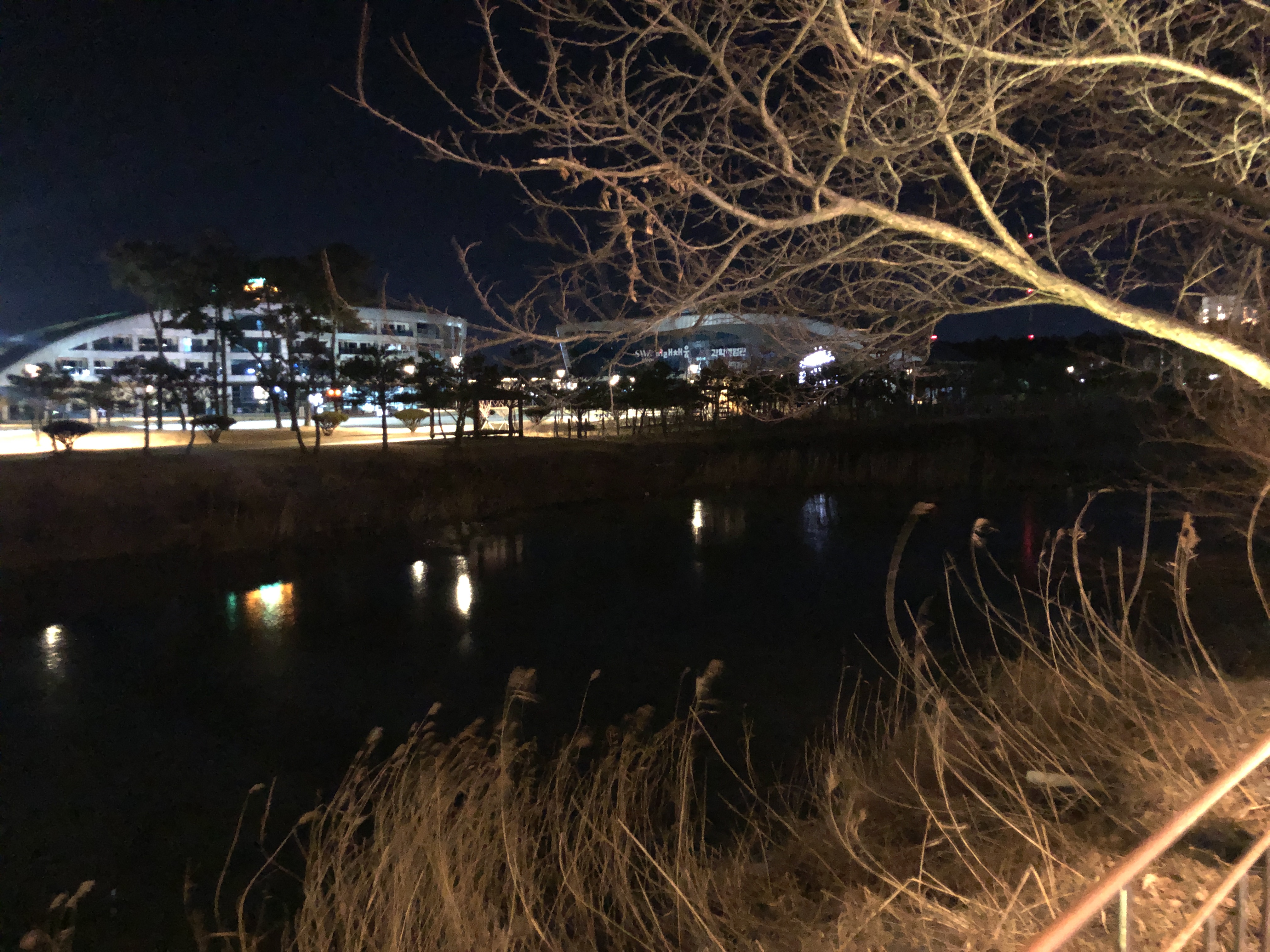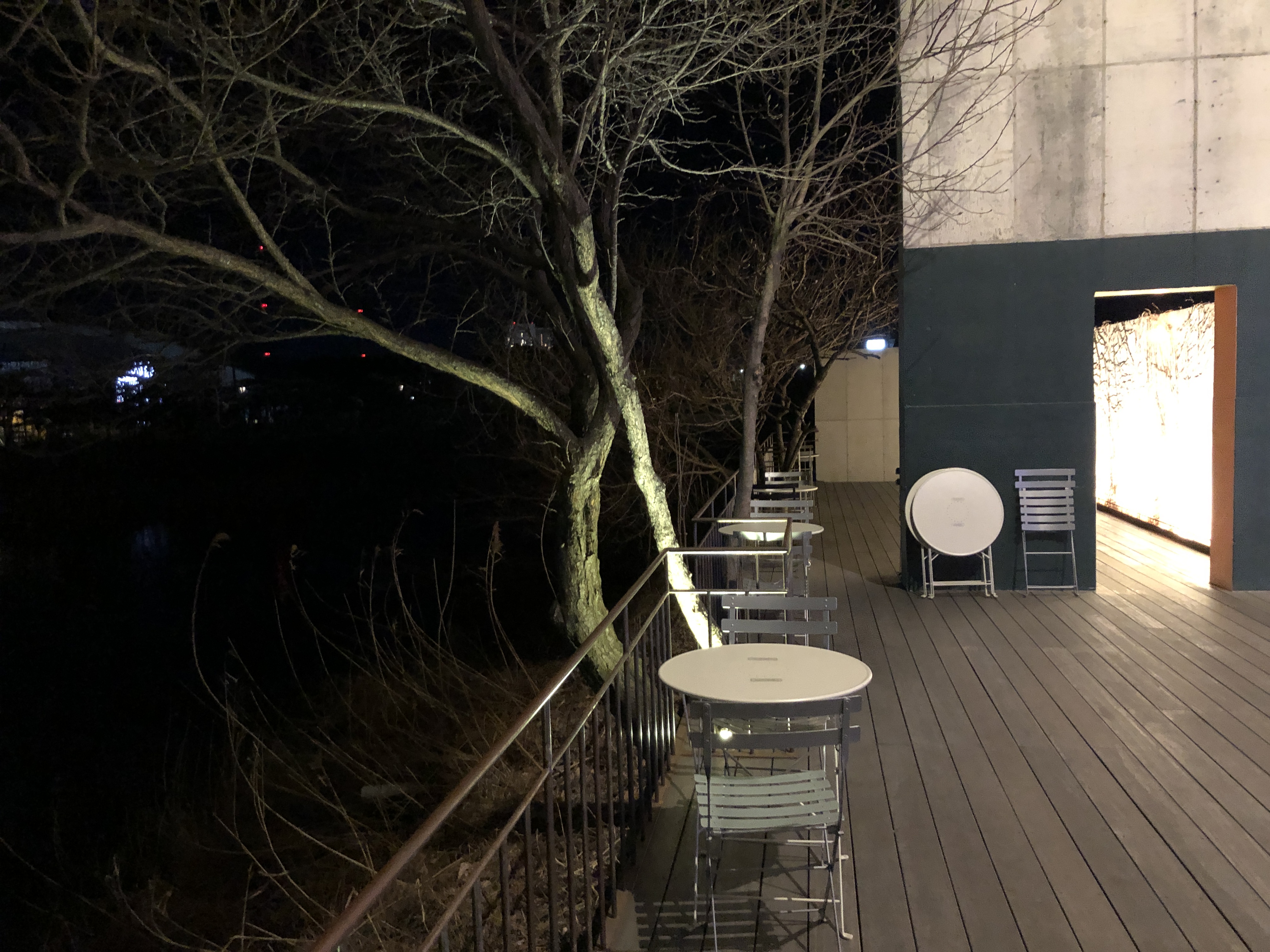[강원 강릉] 천川이 보이는 카페, 테라로사 경포호수점 오른쪽에 보이는 큰 창 옆에는 조그마한 천이 흐르고 있다. 밤이라서 잘 보이진 않지만, 밝을 때 오면 정말 운치있을듯!
