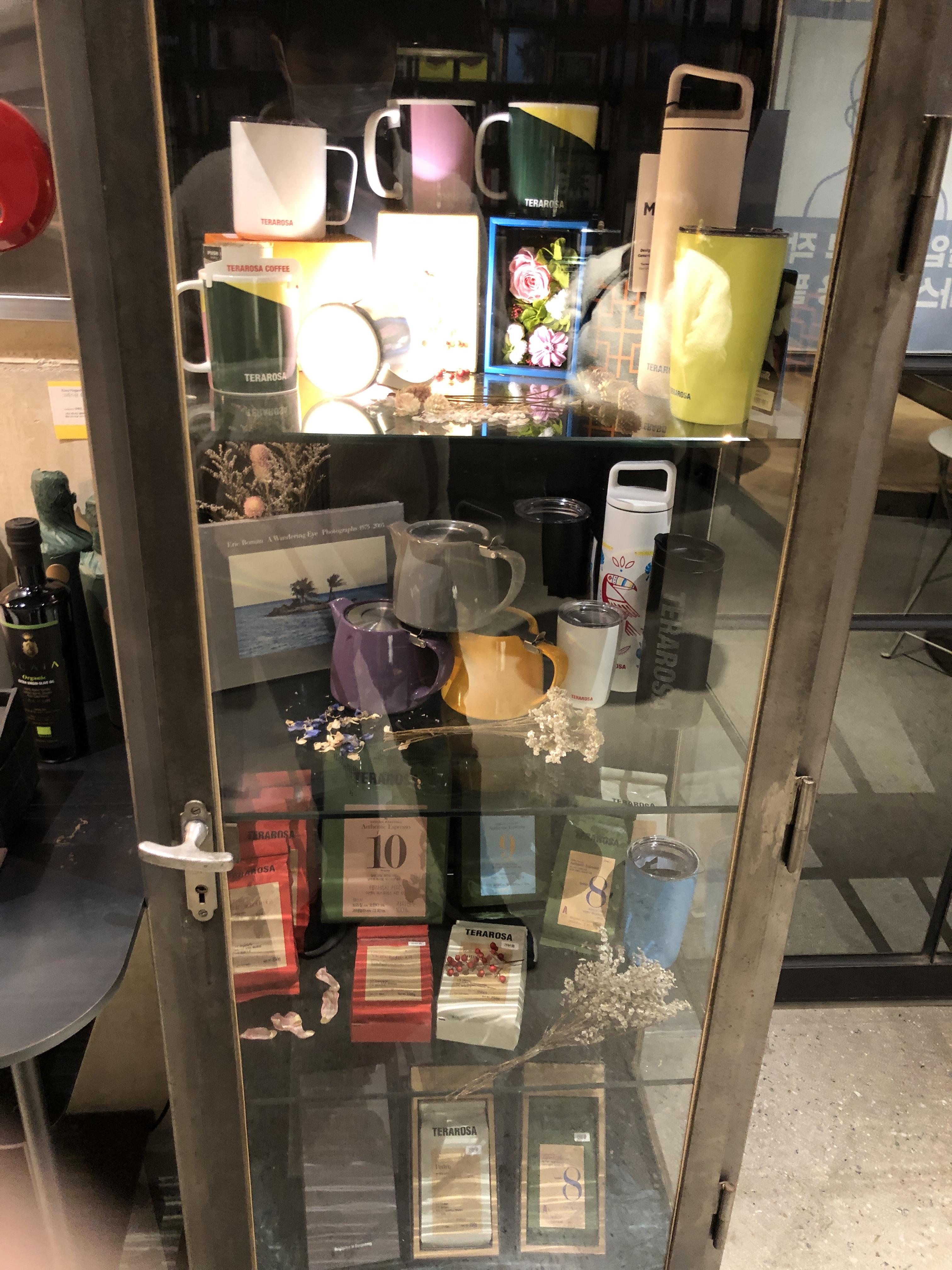 [강원 강릉] 천川이 보이는 카페, 테라로사 경포호수점 생각보다 많은 상품을 디피해두었다. 텀블러도있고, 선물세트도 있고!