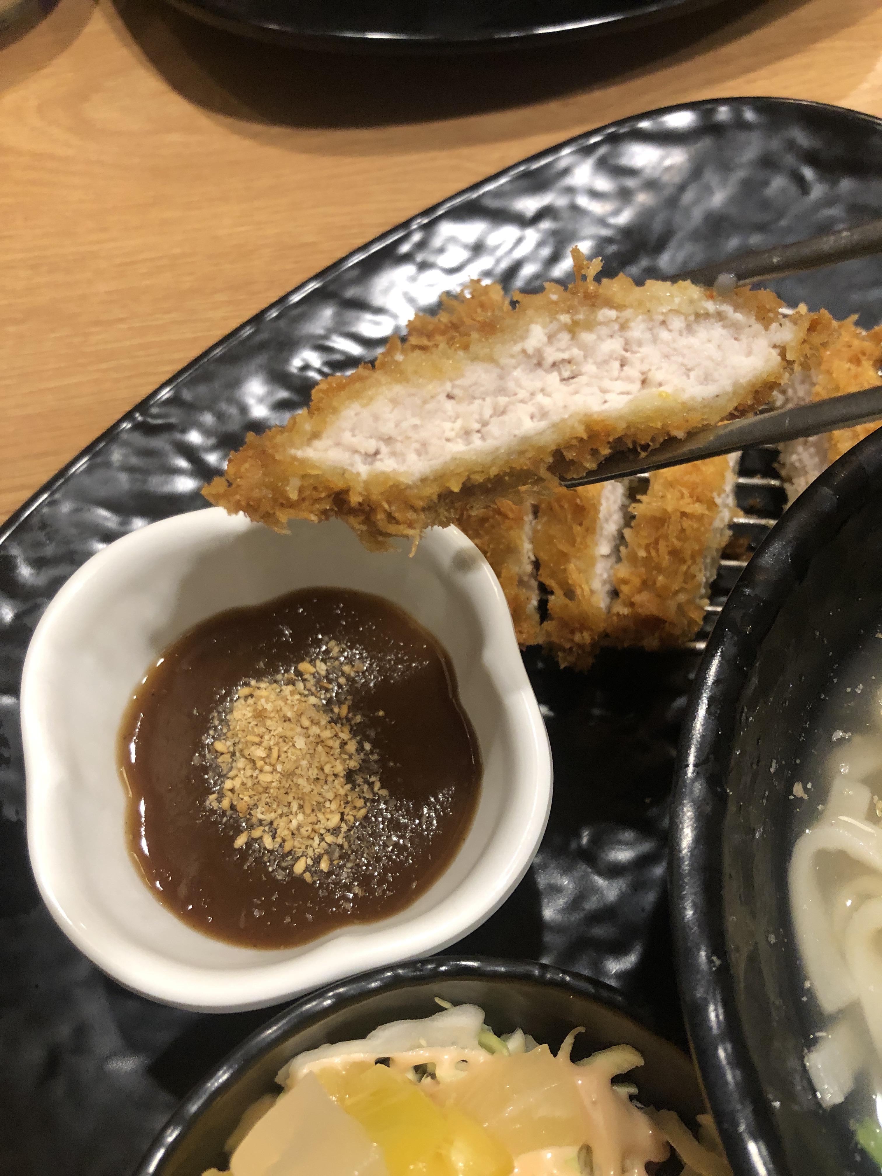 [울산 성안동] 돈칼(돈까스 칼국수)!신기한 조합 백양칼국수 돈까스 두께를 알 수 있는 사진. 새끼손가락 옆면정도 될까나